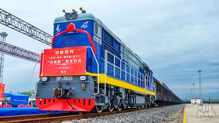 △2021年3月31日,首列43车满载1100余吨食品、精密仪器、日用百货等出口商品的集装箱,搭乘中欧班列“汉西欧”列车从汉中出发,最终抵达鹿特丹及莫斯科。(图/视觉中国)