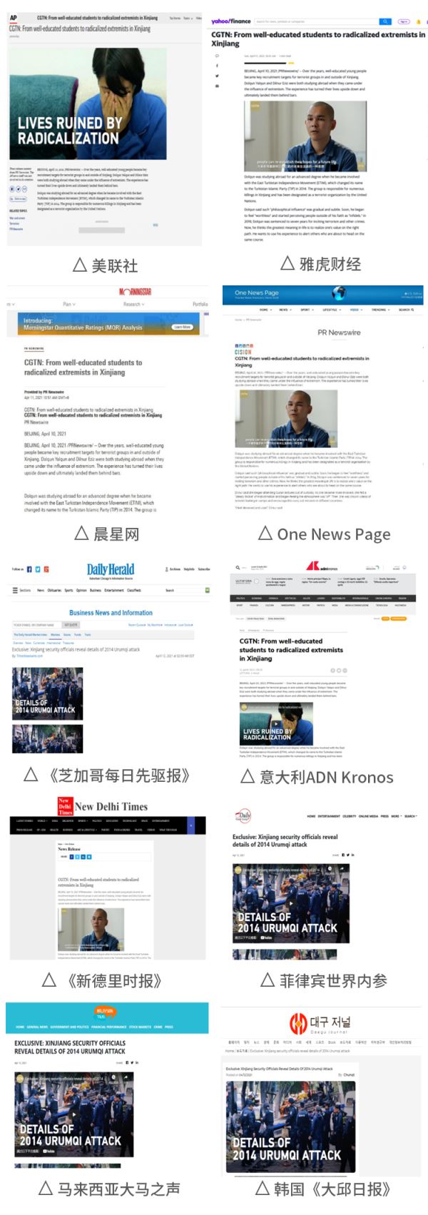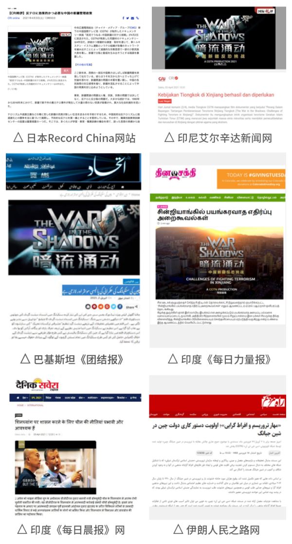 根据纪录片《暗流涌动——中国新疆反恐挑战》内容,CGTN发布《狱中策划纵火杀人,她是否还能被救赎?》《被极端组织盯上的留学生》《极端主义蛊惑下的罪行》等多篇特稿,获得美联社、雅虎财经、晨星网、《美国晨报》、意大利ADN Kronos、《新德里时报》、菲律宾《世界内参》、越南报道网站、马来西亚大马之声、韩国《大邱日报》等近700家主流网络媒体转载,累计触达海外受众4.3亿。