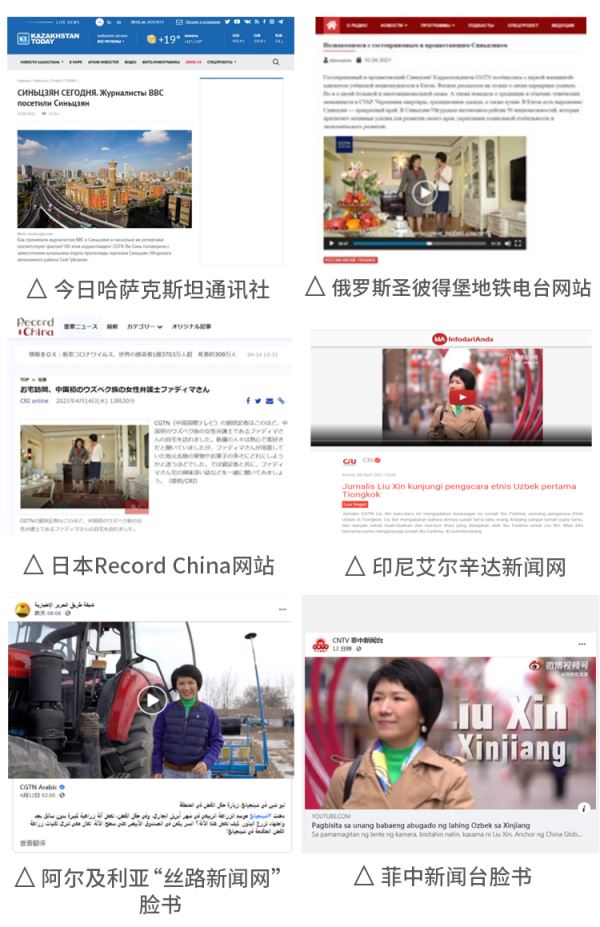 CGTN“刘欣工作室”推出“欣疆之行”系列报道,通过主播刘欣独家专访上合组织秘书长、新疆维吾尔自治区党委宣传部副部长,游历大巴扎、探访乌孜别克族第一位女律师、寻访哈萨克牧民的农场等多形式、多角度报道,以个性化视角展现新疆经济社会发展真实现状。总台多语种融媒平台协同发力,编译发布相关系列报道,通过网站、客户端、海外社交媒体广泛传播。