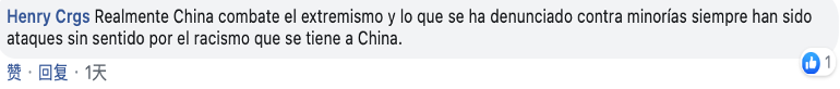 网友Henry Crgs留言:“中国实实在在地在打击极端主义。只有那些因为种族主义(反对中国)的人才会毫无意义地攻击中国的民族政策。”