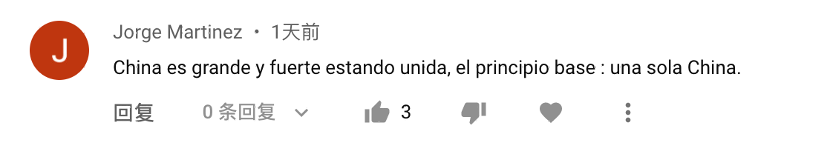 网友豪尔赫·马丁内斯留言:“中国在一个中国的原则基础上,团结起来是伟大和强盛的。”