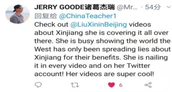 YouTube博主诸葛杰瑞留言:“刚刚看完刘欣在新疆的视频,她报道了新疆的方方面面。她向整个世界证明,西方国家仅仅为了它们自身的利益来传播谎言。她在每一个视频和推特中都说明了这一点。她的视频非常棒!”