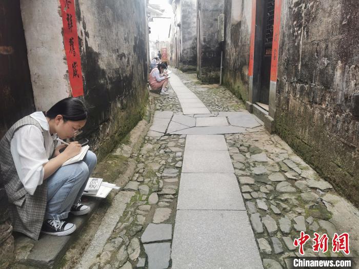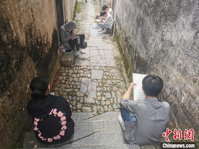在安徽省黄山市黟县碧阳镇南屏村 学生们正坐在巷口写生。储玮玮 摄
