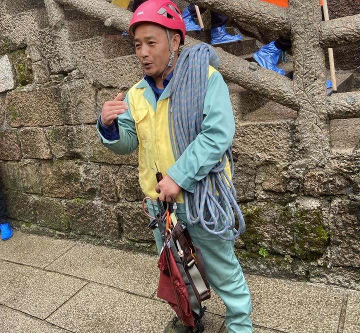 在陡峭的山恋间,巍峨的松树下,我们会看到一群身穿黄马甲的特殊环卫工人,他们肩挎绳索,手持钓鱼杆改造成的特殊工具,每天攀爬在黄山陡峭的崖壁间,用惊险艰辛的工作,守护着黄山的美丽,他们就是黄山美丽的守护者———黄山放绳工。