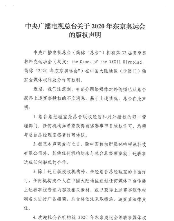 中央广播电视总台关于2020年东京奥运会的版权声明