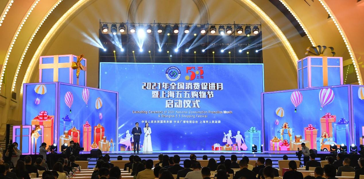 “乐享消费,美好生活。”5月1日晚,由商务部、中央广播电视总台和上海市人民政府联合主办的“2021年全国消费促进月暨上海五五购物节”在上海展览中心启动。中共中央政治局委员、上海市委书记李强,商务部部长王文涛,中宣部副部长、中央广播电视总台台长兼总编辑慎海雄,上海市委副书记、市长龚正,上海市委常委、宣传部部长周慧琳,上海市委常委、市委秘书长诸葛宇杰,上海市副市长宗明,商务部副部长王炳南,以及国家发展改革委、文化和旅游部、市场监管总局等部委有关负责同志出席。