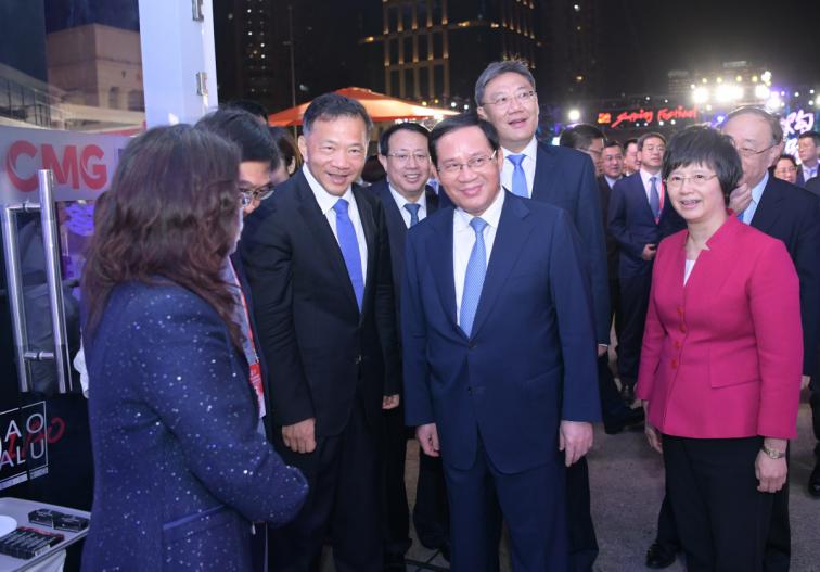 △慎海雄陪同中共中央政治局委员、上海市委书记李强(右四)看望正在进行直播带货的总台央视新闻新媒体工作人员