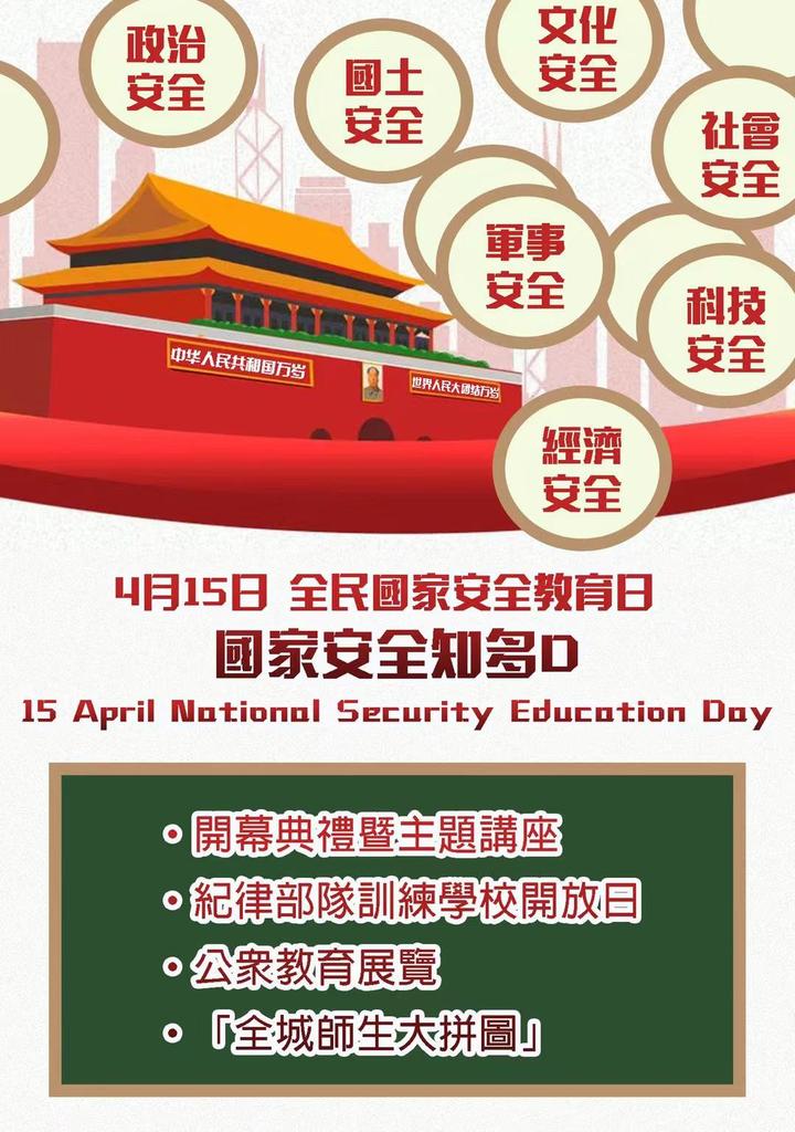 【全民國家安全教育日 認識及反思國民責任】 今年四月十五日是國家第六個「全民國家安全教育日」(「國家安全日」),也是實施《香港國安法》後的第一個「國家安全日」,值得全港市民高度重視及積極參與。學校是教育的地方,應讓學生明白,香港人作為國民,既得到國家的大力支持,亦肩負維護國家安全的責任,並在「愛國者治港」的原則下,實踐「一國兩制」,一起為國家和香港社會的繁榮安定及持續發展作出貢獻。、
