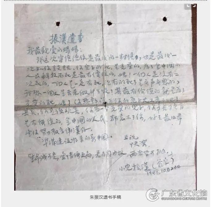 此役前朱振汉积极报名参加决死队,给母亲留下了最后这封信。他在这场战斗中英勇牺牲,时年16岁。后被追认为共产党员。