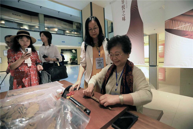 四川什邡,一位海外华文媒体代表在中国雪茄博物馆体验手工制作雪茄。王磊 摄