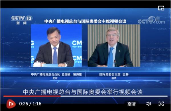 中央广播电视总台昨晚(5月18日)与国际奥委会举行视频会谈。总台台长慎海雄与国际奥委会主席巴赫就东京奥运会和北京冬奥会转播、奥运赛事版权合作、央视奥林匹克频道开播等工作达成一致。