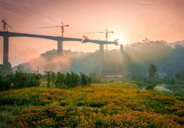17日,大田县华兴镇的一片金鸡菊花海与正在建设中的兴泉铁路,在朝霞映照下,成为一道美丽风景线。兴泉铁路(大田段)工程项目全长60.28公里,工程总投资概算45.84亿元。