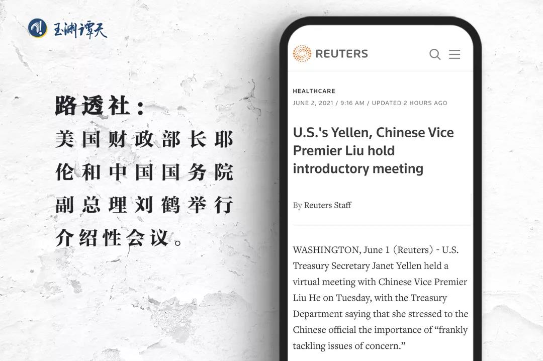 6月2日上午,中共中央政治局委员、国务院副总理、中美全面经济对话中方牵头人刘鹤与美财政部长耶伦举行视频通话。6天前,他与美国贸易代表戴琪刚通过电话。
