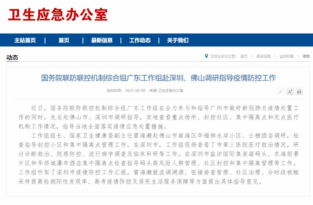 國家衞健委網站截圖據國家衞健委網站消息,近日,國務院聯防聯控機制綜合組廣東工作組在全力參與和指導廣州市做好新冠肺炎疫情處置工作的同時,先後赴佛山市、深圳市調研指導,實地查看重點場所、封控社區、集中隔離點和定點醫療機構工作情況,指導當地全面落實疫情應急處置措施。
