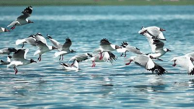 △棕头鸥成群掠过湖面(总台央视记者毛保武拍摄)