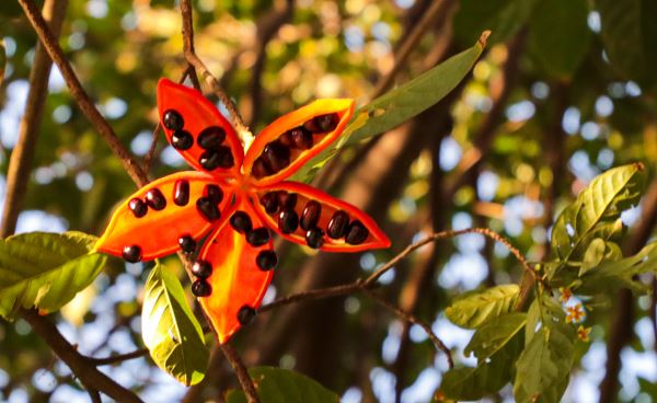 Beautiful red fruits hanging on the tree like flying butterflies, Sterculia Lanceolata Cav on the streets of Guangzhou has become an attractive scene. The flowers on the trees are large in number, but they are tiny in size and difficult to discover, so their florescence is often missed out on. The fruits of Sterculia Lanceolata Cav, however, are bright red, like flaming stars or the starfish in the ocean. Such an eye-catching plant will bring the enjoyment of beauty to whoever encounters it on the street, and early June is the best time to admire them.