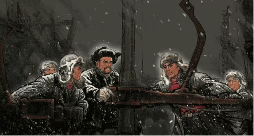 旁边的工友们全神贯注地盯着这紧张的操作,他们的帽子上像钻井基座一样已结了冰雪,但此时他们全然不顾,时刻准备配合铁人王进喜协同作业。