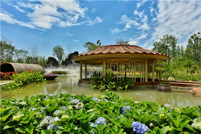 福建室外展园主题为“锦绣山河中国梦,花韵流芳福建情”。展园分为“福建人家”“日月同辉”“花田喜事”三个主题分区,分别展现福建的人文、自然和花艺特色,着力打造一个凝缩福建文化的浪漫花园。在植物营造方面,展园甄选福建地区代表性植物,如榕树、三角梅、月季、竹子、芭蕉、枇杷等,通过植物与建筑、山石、水体等要素的有机结合,形成以绿为底、以水为带、以花为题的花卉景观。
