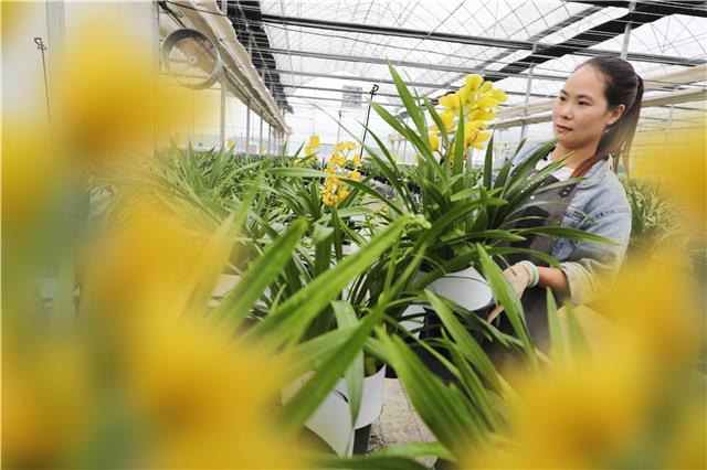 25日,在位于周宁县山海协作产业园的向山兰园基地内,技术员正观察大花蕙兰试验品种开花情况。