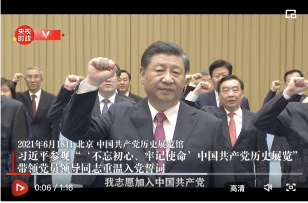 在庆祝中国共产党成立100周年之际,中共中央总书记、国家主席、中央军委主席习近平18日前往中国共产党历史展览馆,参观“‘不忘初心、牢记使命’中国共产党历史展览”,并带领党员领导同志重温入党誓词。