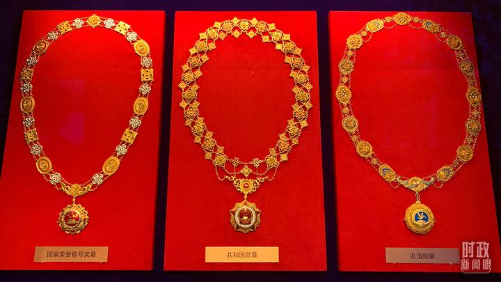 △从左至右分别是国家荣誉称号奖章、共和国勋章、友谊勋章(总台央视记者石丞拍摄)