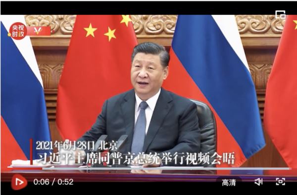 习近平说:“尊敬的普京总统,我亲爱的老朋友,我很高兴与你举行视频会晤。 这是来自好邻居、真伙伴的祝福和支持,中方深表感谢。”