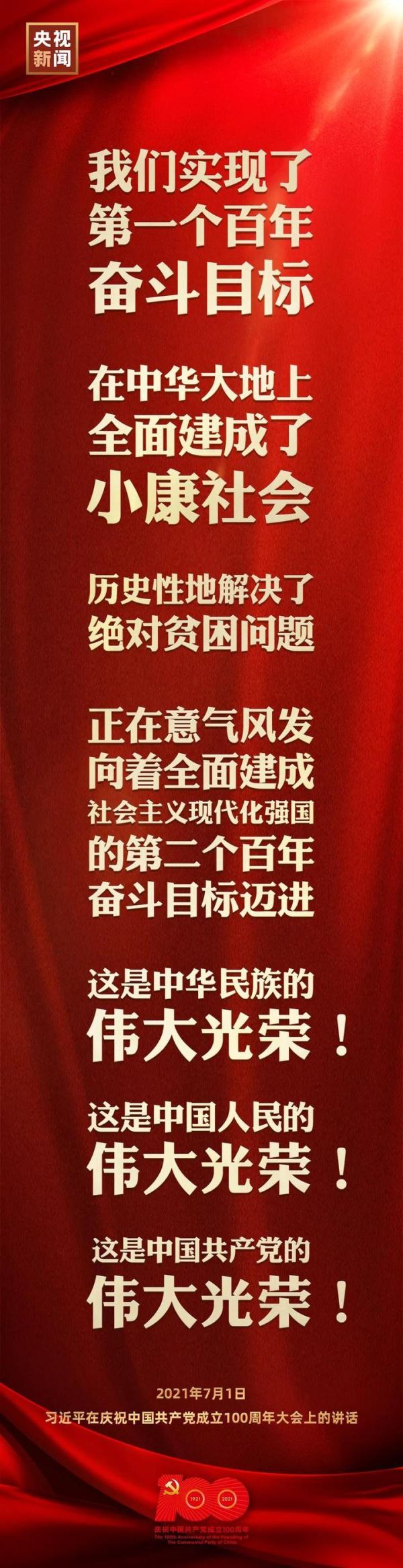 习近平:在这里,我代表党和人民庄严宣告,经过全党全国各族人民持续奋斗,我们实现了第一个百年奋斗目标,在中华大地上全面建成了小康社会,历史性地解决了绝对贫困问题,正在意气风发向着全面建成社会主义现代化强国的第二个百年奋斗目标迈进。