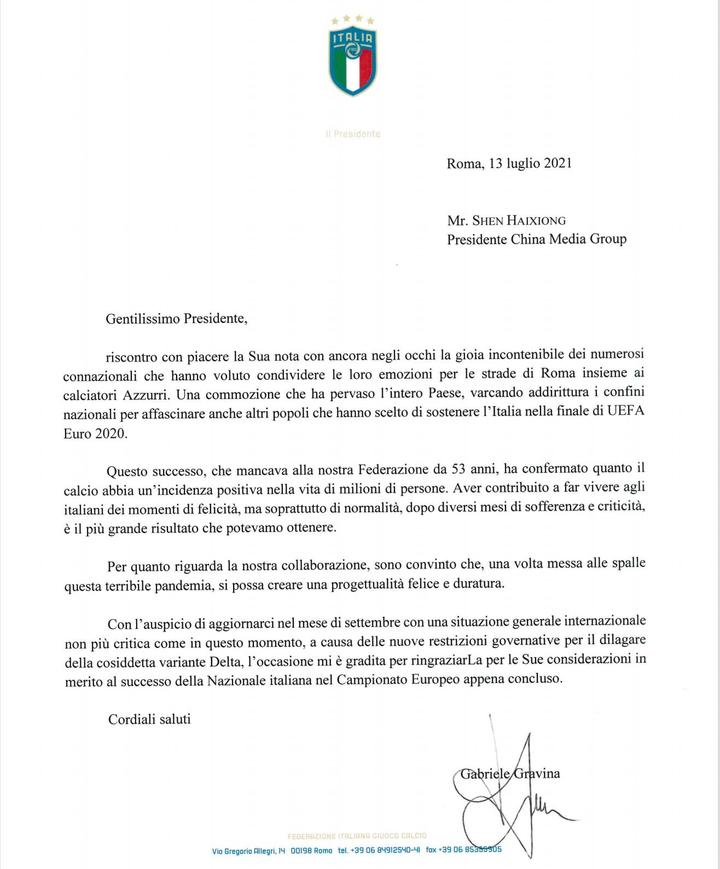 7月13日,意大利足协主席格拉维纳复函中国中央广播电视总台,表示期待疫情好转后,可以马上与总台开启令人满意的长期合作。