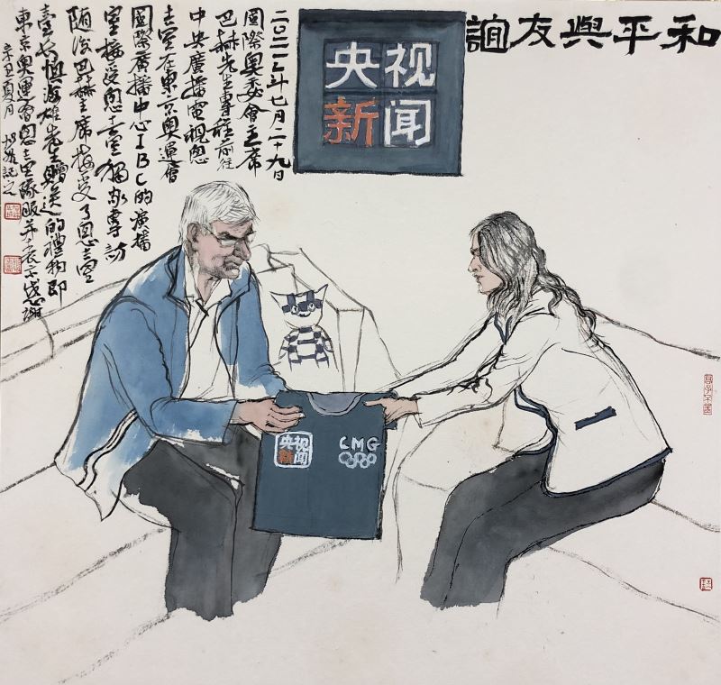 7月29日,国际奥委会主席巴赫在东京奥运会中央广播电视总台演播室接受专访,并欣然收下了一件总台奥运工作服。国家画院美术馆馆长、“为奥运喝彩”艺术写生团团长何加林当即用画笔将这一幕生动记录了下来。