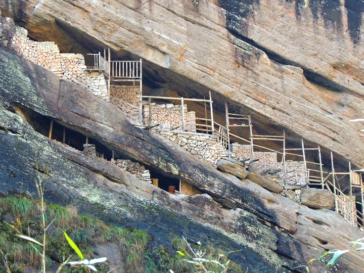 丹霞嶂古崖居遗构俗称天车架,位于武夷山山北水帘洞景区章堂涧南岸丹霞嶂半崖的岩穴中。崖居由山门、峭壁石坎,接水工程、小石门、大石门、危梯和居住区等组成。居住区由砖斗墙、圆柱、木栏杆、悬梯、吊台、吊车(辘轳)组成。以木结构为主,有柱无梁,应用穿斗、榫槽传统木匠工艺依崖凿孔构就。风格原始简陋,传统古朴。整个建筑呈东高西低走势。居所共有四个(即ABCD)洞穴、洞中呈坡度内高外低相连、大小有异。总长108米,进深2.5至17米,高2至5米不等。洞内发现三处石刻,一百余字,洞内发现灶台、石臼 、陶、瓷、木、竹、谷碾、木跟绣花鞋(三寸金莲)、便桶等生活器皿残片。证实丹霞嶂崖居遗构(天车架)是当地富绅在清咸丰七年(1857年)至光绪二十六年(1900年)为躲避太平军进军崇安时“择险至此”而建的避难居所。