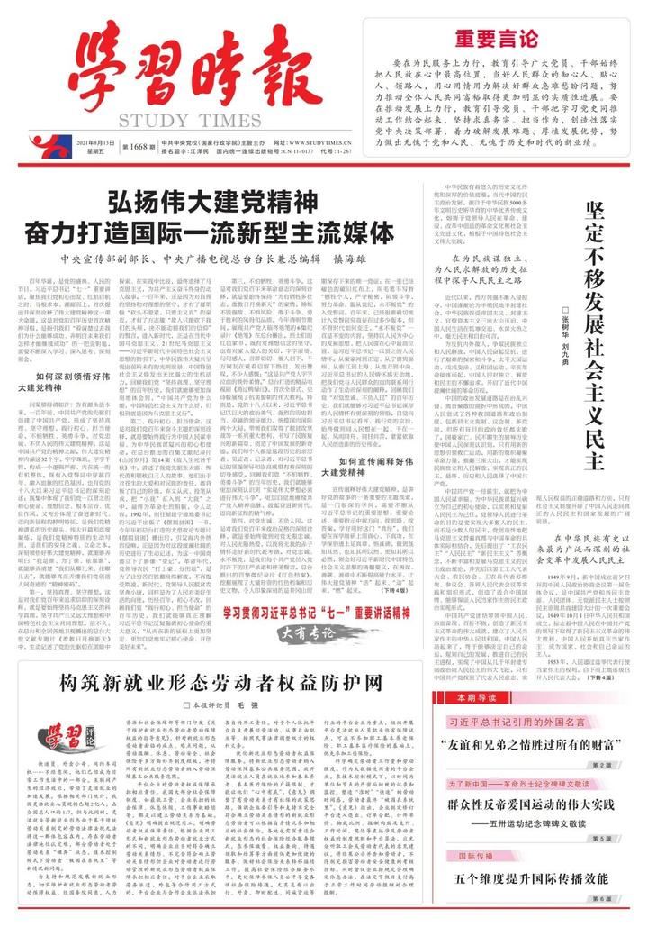 第二,弘扬伟大建党精神,奋力打造国际一流新型主流媒体,我们要从百年党史中不断汲取思想的力量,深入学习深刻领会新时代党的创新理论,始终高举习近平新时代中国特色社会主义思想伟大旗帜。习近平新时代中国特色社会主义思想是当代中国马克思主义、21世纪马克思主义,是全党全国人民为实现中华民族伟大复兴而奋斗的行动指南。坚持把学习贯彻习近平新时代中国特色社会主义思想作为终身必修课,深入学习贯彻习近平总书记“七一”重要讲话精神,持续在学懂弄通做实上下功夫,深刻把握蕴含其中的强大真理力量和实践伟力,切实用以武装头脑、指导实践、推动工作。持续深化提升总台“头条工程”,以最高标准、最优质量、最佳效果深化提升领袖宣传报道,让党的创新理论“飞入寻常百姓家”、领袖魅力风采广泛传播全世界。把新时代党的创新理论与习近平总书记对总台工作的一系列重要指示批示精神联系起来学习、贯通起来思考,不断从中找方法、找启迪、找答案,切实提高把握新发展阶段、贯彻新发展理念、构建新发展格局的政治能力、战略眼光、专业水平,推动习近平总书记重要指示批示精神在总台落到实处、见到实效。