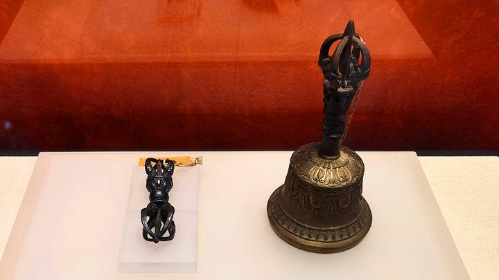 △珍藏在承德博物馆中的铜铃、杵,是六世班禅为乾隆皇帝祝寿敬献的礼品之一。(总台央视记者马立飞拍摄)