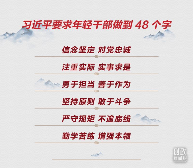 时隔8年,总书记对年轻干部提出了48个字的要求。生逢伟大时代的年轻干部们,抓紧练好内功、提升修养,不负韶华、勇担重任!