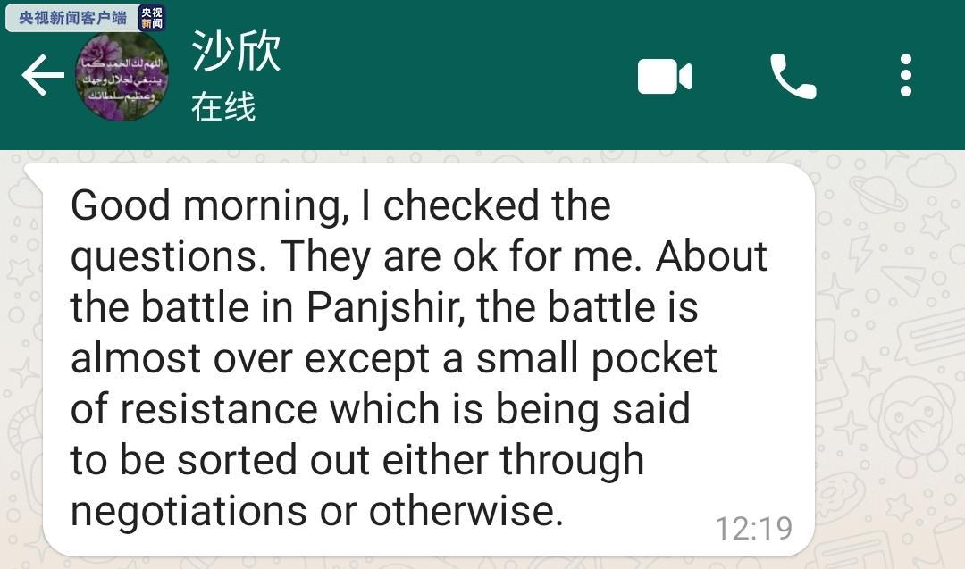 塔利班发言人沙欣当地时间9月5日接受中央广播电视总台记者独家采访时表示,潘杰希尔的战斗几乎结束。对于剩余的一小部分抵抗力量,将通过谈判或其他方式解决双方分歧。(总台记者 李霜溪)
