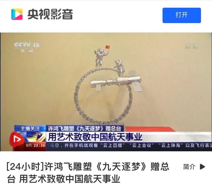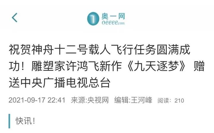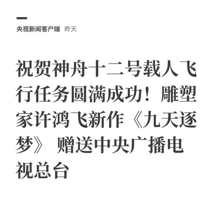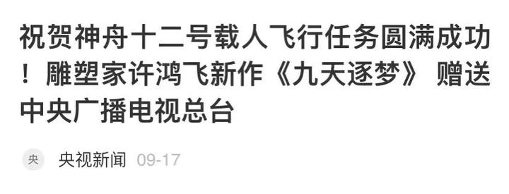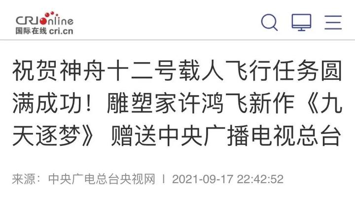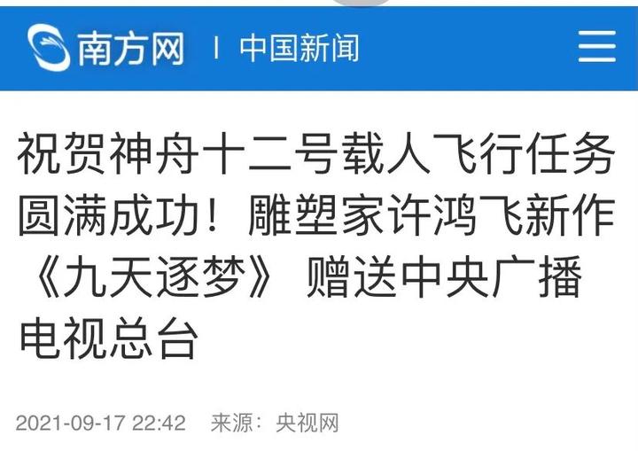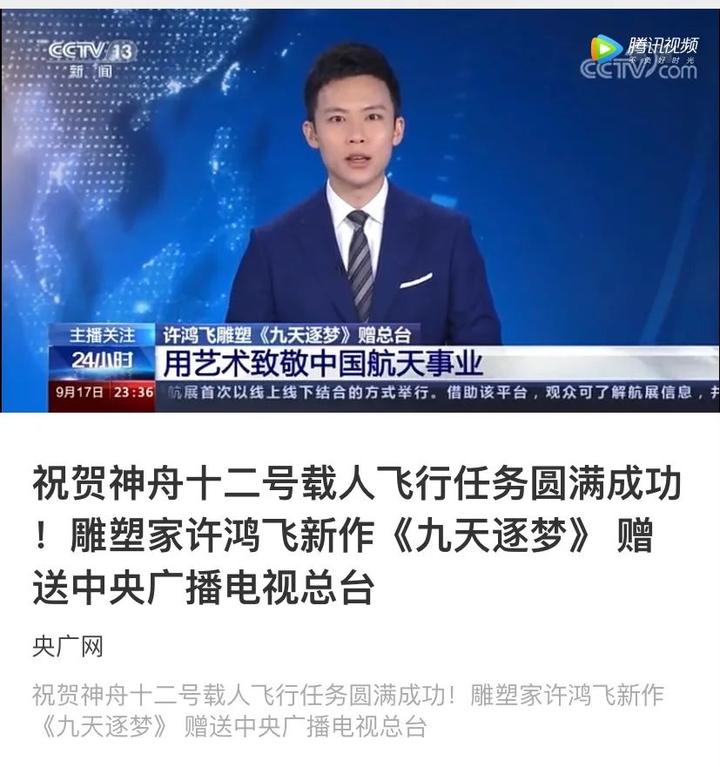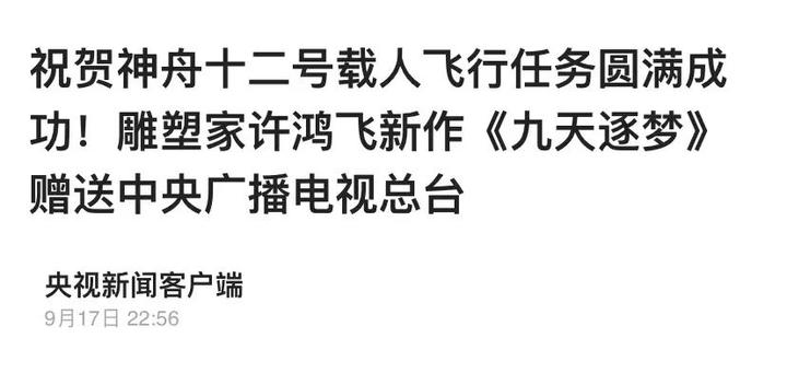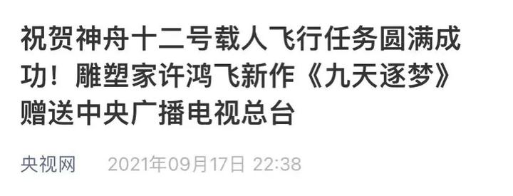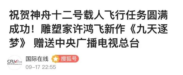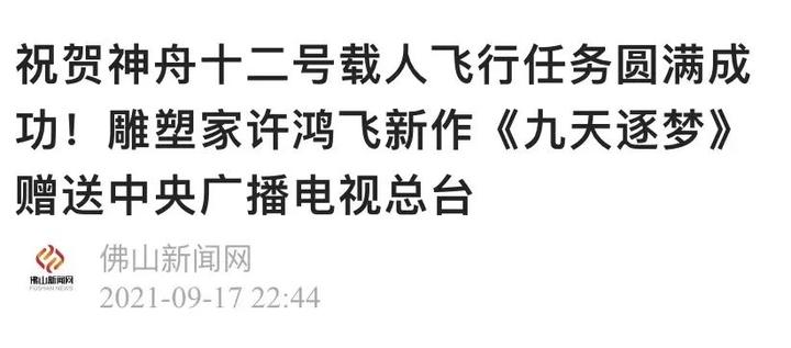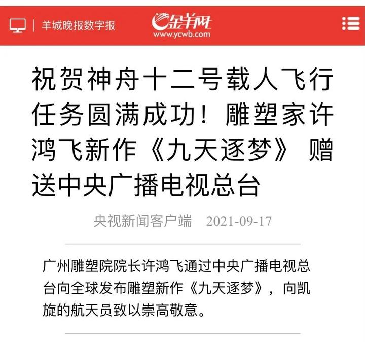 近日,全国政协委员、广州雕塑院院长许鸿飞创作完成了反映我国航天壮举的雕塑作品《九天逐梦》,在中央电视台新闻频道播出,作品赠送给中央广播电视总台收藏,受到媒体广泛关注。