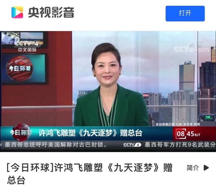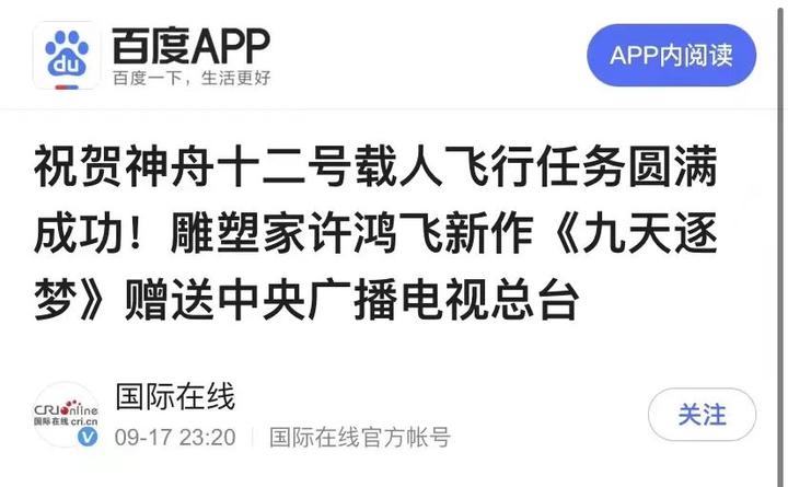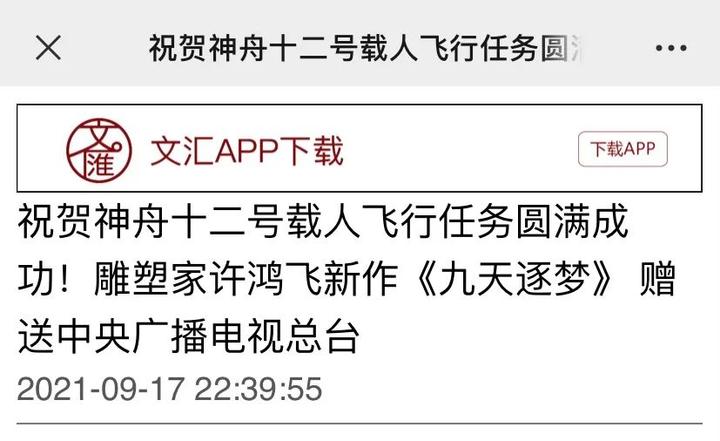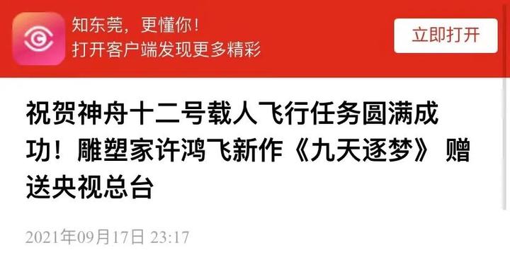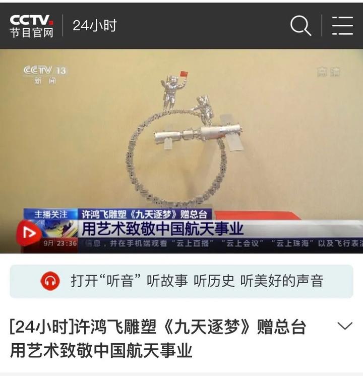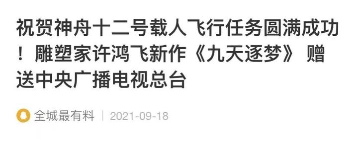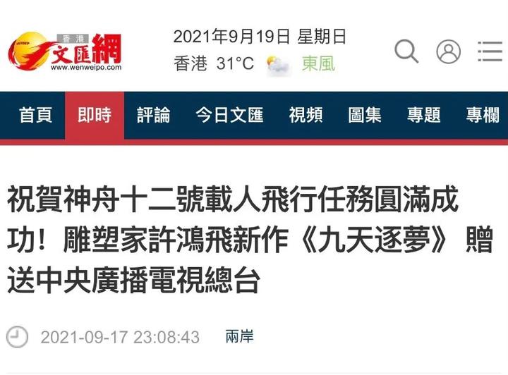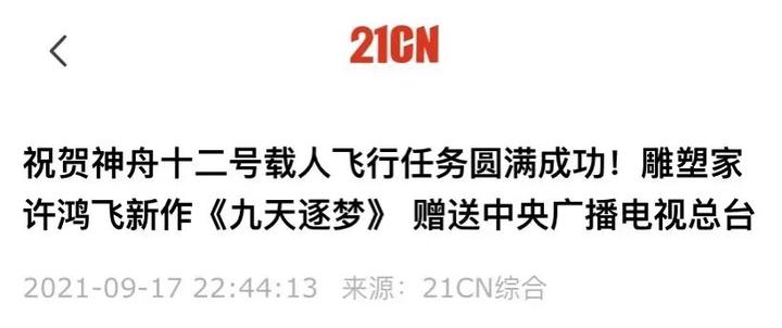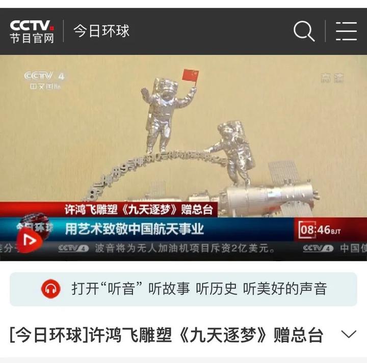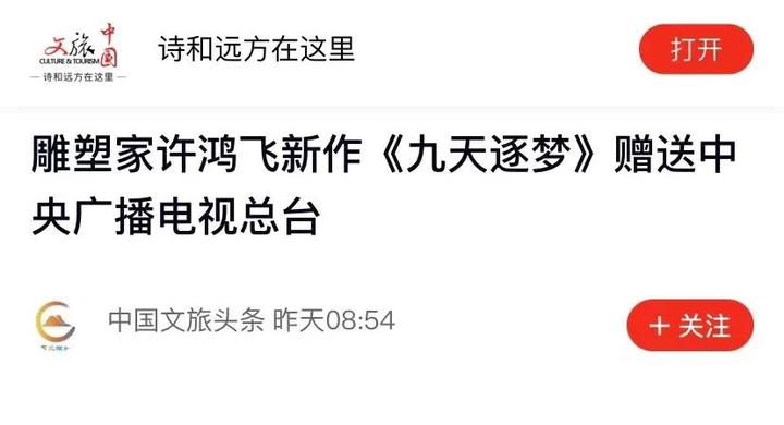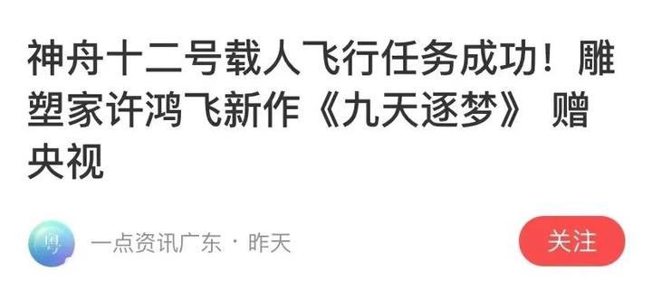 近日,全国政协委员、广州雕塑院院长许鸿飞创作完成了反映我国航天壮举的雕塑作品《九天逐梦》,在中央电视台新闻频道播出,作品赠送给中央广播电视总台收藏,受到媒体广泛关注。