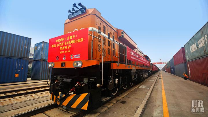 △2021年7月5日,中国青岛,上合示范区前往塔吉克斯坦的首班中欧班列(齐鲁号)发出。(图/视觉中国)