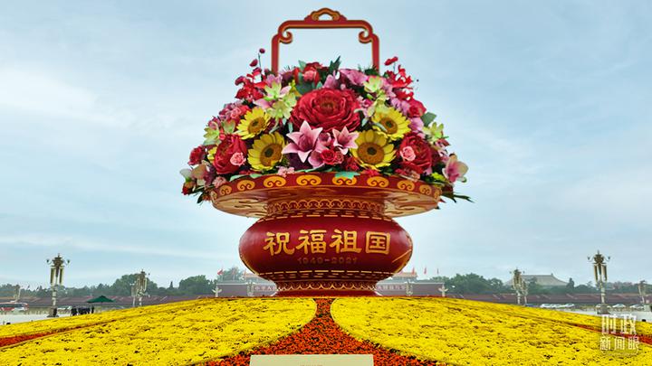 △天安门广场中央,“祝福祖国”巨型花篮。(总台央视记者耿小龙拍摄)