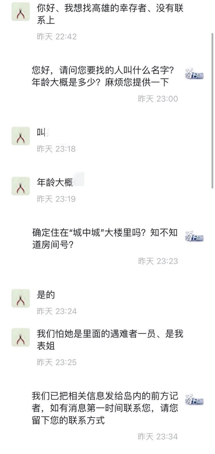 据台海之声和“看台海”记者综合报道,高雄市盐埕区“城中城”大楼14日凌晨发生火灾,已确认46人死亡、41人受伤,中央广播电视总台台海之声和“看台海”新媒体第一时间推出专栏《高雄“城中城”大楼火灾特别报道》,及时提供相关救援信息,帮助家属寻找火灾伤亡者线索,并公布了救援联系电话0086-10-86090679。报道发出后,已有多位网友联系“看台海”寻找失联的家属。总台驻台记者第一时间与高雄市消防局、殡仪馆等单位沟通联系,失联家属信息持续确认核实当中。其中已确认一位网友的亲属遇难,该名遇难者为早年嫁到台湾的大陆配偶。