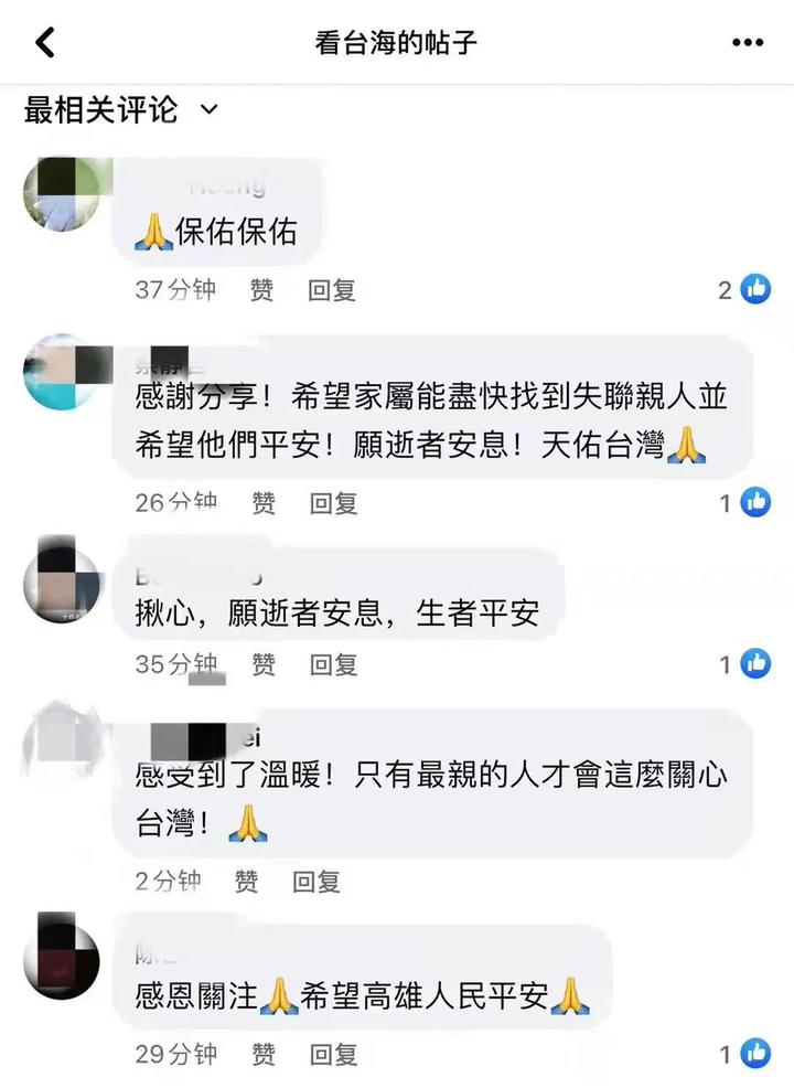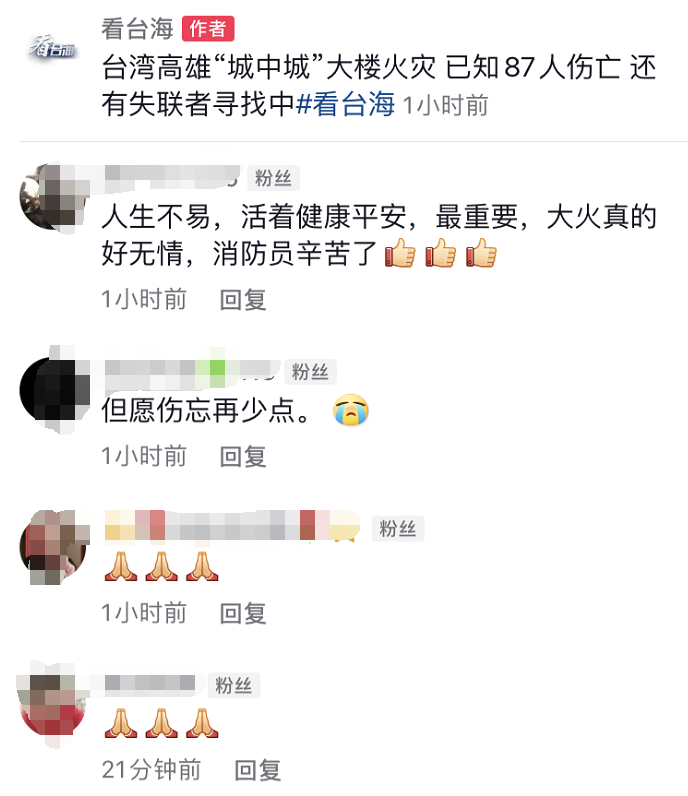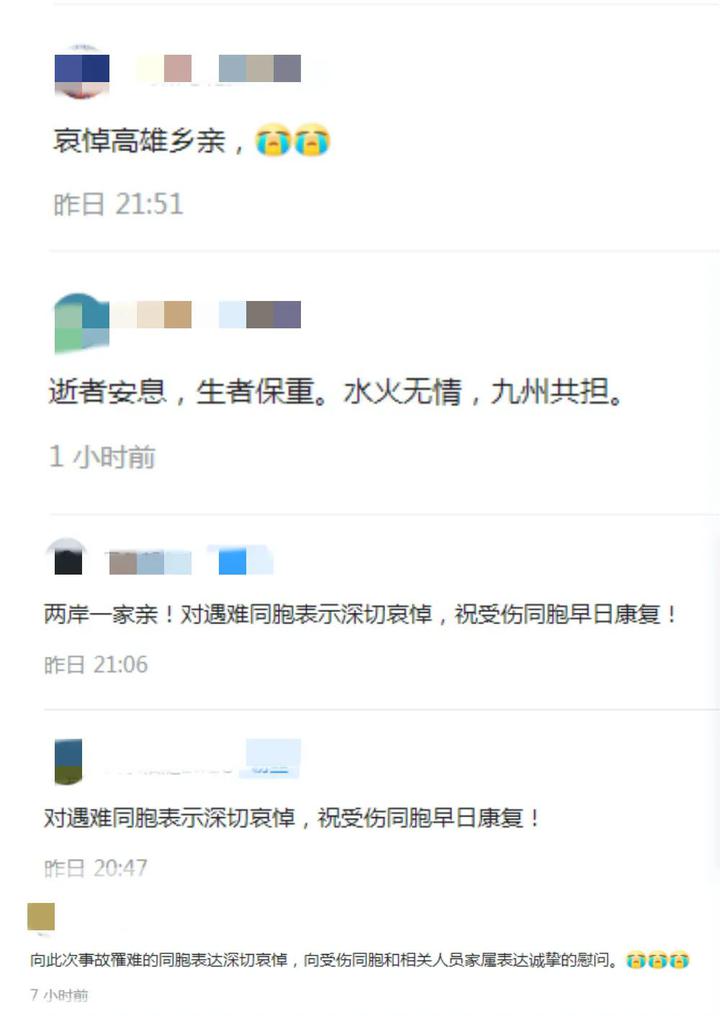 高雄火灾事故发生后,国务院台办、海峡两岸关系协会、中国红十字会都向此次事故罹难的同胞表达深切哀悼,向受伤同胞和相关人员家属表达诚挚的慰问。事故同样牵动着大陆网友的心,许多网友通过“看台海”新媒体平台及总台各新媒体平台留言对海峡对岸的骨肉天亲表达慰问。
