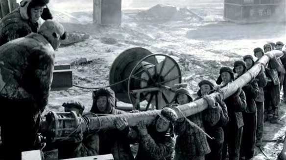 当年,在一眼望不到头的白茫茫盐碱地上,钻井队工人靠人拉肩扛,把生产设备运送到井场。(资料图)