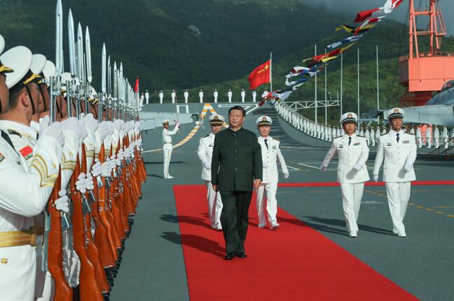 2019年12月17日,我国第一艘国产航空母舰山东舰在海南三亚某军港交付海军。习近平出席交接入列仪式并登舰视察。这是仪式结束后,习近平登上山东舰,检阅仪仗队。新华社记者 李刚 摄