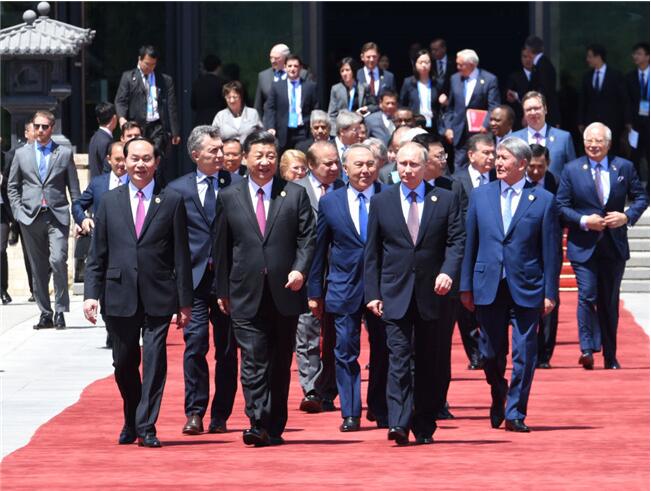 2017年5月15日,在北京雁栖湖举行的“一带一路”国际合作高峰论坛第一阶段会议结束后,习近平同与会领导人和国际组织负责人步出雁栖湖国际会议中心。新华社记者 饶爱民 摄