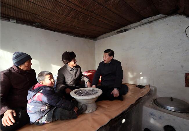 就任总书记一个多月,他就冒着零下十几摄氏度的寒冷,乘车300多公里来到太行山深处的贫困县阜平县,走进农家,盘腿坐在炕上,拉着乡亲的手,问他们生活怎样。那次他说,看到老区一些乡亲生活还比较困难,“心情是沉重的”。