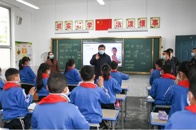 2020年4月21日,习近平来到陕西省安康市平利县老县镇,在中心小学考察脱贫攻坚情况。新华社记者 谢环驰 摄