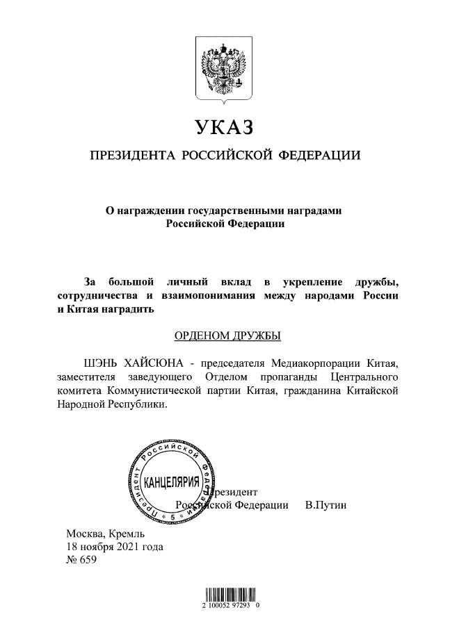莫斯科当地时间11月18日,俄罗斯政府法律信息门户网站发布俄罗斯总统普京签署的总统令,授予中国中央广播电视总台台长慎海雄“友谊勋章”。