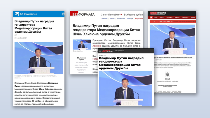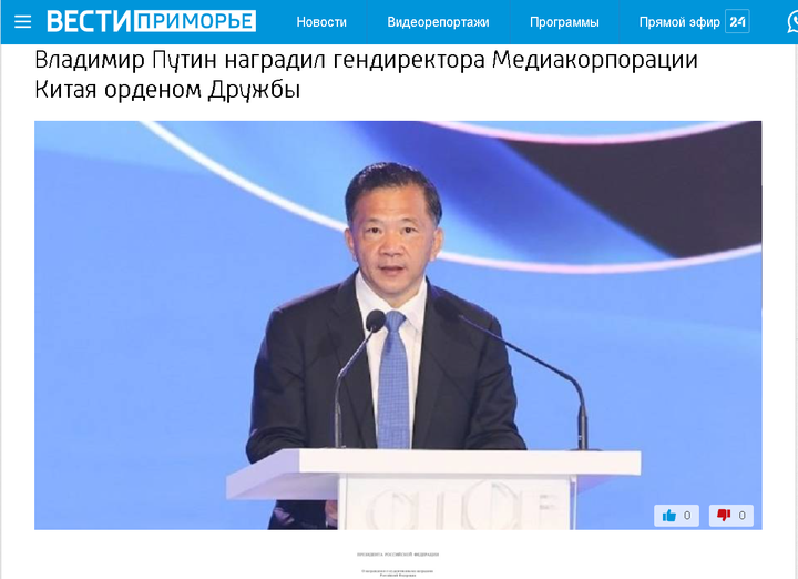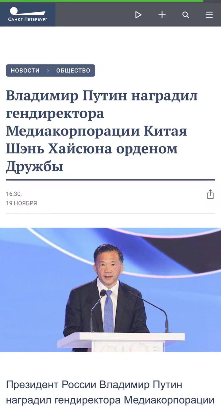 俄罗斯全俄国家电视广播公司21日在其网站对慎海雄台长荣获普京总统授予“友谊勋章”进行了报道。