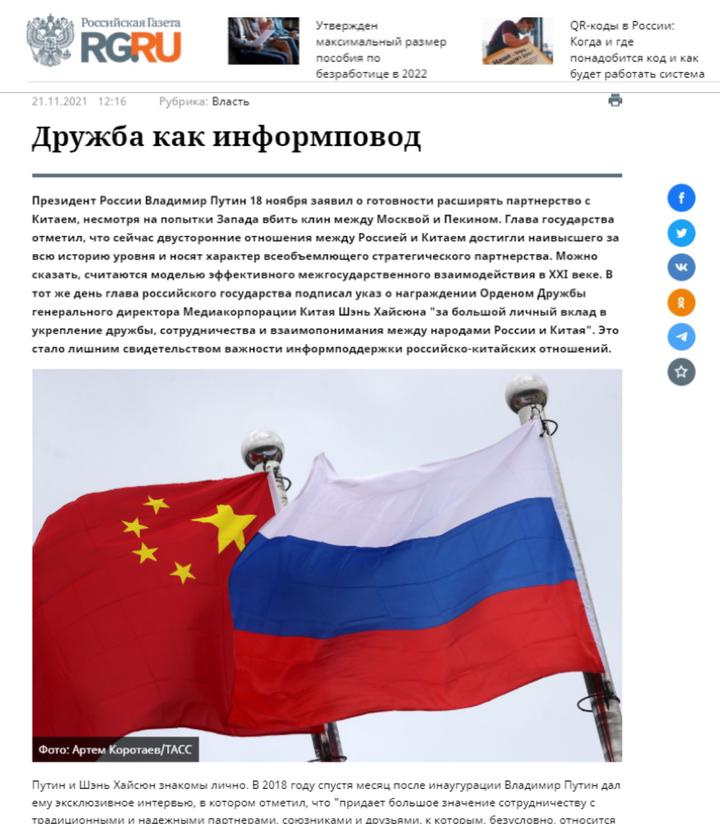 俄罗斯政府机关报《俄罗斯报》11月18日当天对普京总统授予中央广播电视总台台长慎海雄“友谊勋章”进行了报道。11月21日,《俄罗斯报》在其官方网站“政权”栏目发表《媒体合作筑牢俄中友谊》述评指出,俄罗斯总统普京11月18日在俄外交部部务会扩大会议上对俄中关系给予高度评价,强调将同中方深化国际协作,共同应对某些国家离间分化企图。同日,普京签署总统令,授予中央广播电视总台台长慎海雄“友谊勋章”,表彰其对巩固俄中人民友谊、合作,增进互相之间的了解做出的巨大贡献。这再次证明媒体合作对两国关系发展的重要意义。文章强调,中央广播电视总台一直致力于推动俄中媒体间的交流合作。