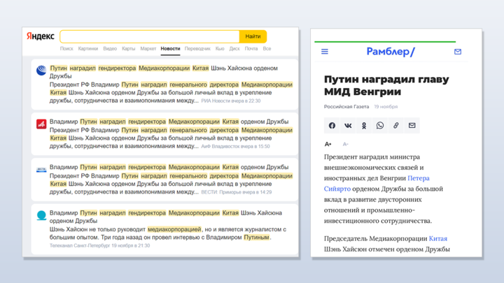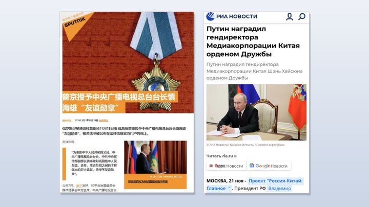 俄罗斯卫星通讯社、全俄访问量最大的新闻类网站俄新网分别于11月19日和21日对普京总统授予中央广播电视总台台长慎海雄“友谊勋章”进行了报道。报道还称,今年是《中俄睦邻友好合作条约》签署20周年,作为俄中友好、和平与发展委员会媒体理事会中方主席的慎海雄与俄方主席、今日俄罗斯国际通讯社社长基谢廖夫于7月共同发表题为《加强媒体合作筑牢睦邻友好》的倡议。该倡议号召两国媒体在新闻内容互换、技术创新和经验交流等方面进一步深化合作。