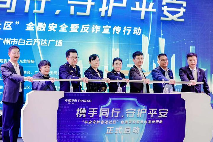 携手同行,守护平安——“平安守护者进社区”金融安全暨反诈宣传行动正式启动后,中共广州市白云区委常委、政法委书记陈玉云女士和广东省公安厅新闻中心副主任周元为中国平安和广州市白云区24个镇街平安守护者志愿队授旗。各支平安守护者志愿队将深入各镇街、企业、商铺、家庭,为广大群众通过宣讲反诈,让群众听得懂、记得牢,做到“不听、不信、不转账”,守住钱袋子!